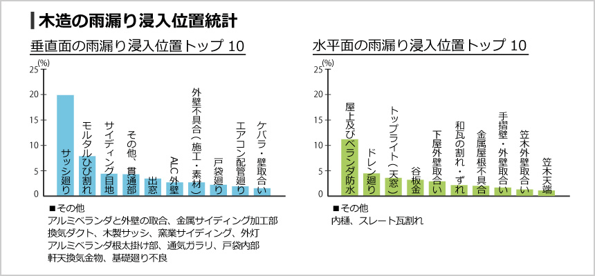 上記グラフは、木造住宅の雨漏り浸入位置の統計を取ったものです。見ていただくとお分かりのように、雨漏りの原因箇所は様々な場所が考えられます。この例は、木造の場合であって、鉄筋コンクリート造や鉄骨造になると、浸入箇所は異なります。