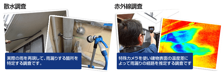 これらの知識で原因箇所を推測し、散水調査やサーモグラフィー調査によって原因箇所を特定します。この原因箇所を特定してからはじめて雨漏りを止める技術が必要になります。
